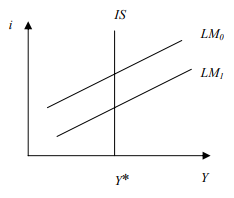 Now, the assumption that investment is not responsive to the interest rate is equivalent to saying that b2 = 0. You can see that this implies that the slope of the IS curve is infinite and that the intercept is also infinite. Thus, the IS curve is a vertical line. Monetary policy leads to shifts in the LM curve, however, these shifts do not change output at all since the equilibrium point always remains on the vertical IS curve.