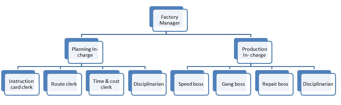 Foreman is the lowest ranking manager and the highest ranking worker. He is the pivot around whom revolves the entire production planning, implementation and control. Thus, Taylor concentrated on improving the performance of this role in the factory set-up. In fact, he identified a list of qualities of a good foreman/supervisor and found that no single person could fit them all. This prompted him to suggest functional foremanship through eight persons. Taylor advocated separation of planning and execution functions. This concept was extended to the lowest level of the shop floor. It was known as functional foremanship. Under the factory manager there was a planning incharge and a production incharge. Under planning incharge four personnel namely instruction card clerk, route clerk, time and cost clerk and a disciplinarian worked. These four personnel would draft instructions for the workers, specify the route of production, prepare time and cost sheet and ensure discipline respectively. Under Production incharge, personnel who would work were speed boss, gang boss, repair boss, and inspector. These respectively were responsible for timely and accurate completion of job, keeping machines and tools etc., ready for operation by workers, ensure proper working condition of machines and tools and check the quality of work. Functional foremanship is an extension of the principle of division of work and specialization to the shop floor.