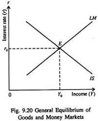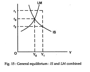 By combining the commodity and money market equilibrium schedules (the IS and LM curves) as in Fig. 15, we can see that only one combination of r and Y (the combination r0 and Y0) can simultaneously clear both the money and commodity markets.