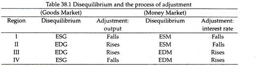 We know (from Fig. 38.8) that there is an excess supply of money above the LM curve, and hence we show ESM in regions I and II in Table 38.1. Similarly we know (from Fig. 38.4) that there is excess demand for goods below the IS curve. Hence, we show EDG for regions II and III in Table 38.1. The remaining entries of Table 38.1 can be explained in a similar way.