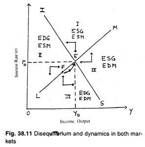 (2) The interest rate rises when there is an excess demand for money and falls when there is an excess supply of money. (This follows from the Keynesian liquidity preference theory). Fig. 38.11 shows how they move over time. Four regions are shown in this diagram and they are characterized in Table 38.1.