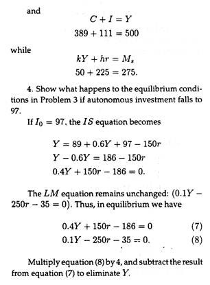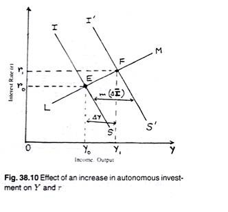 As a result national income increases, and the equilibrium level of national income rises. But the increase in income (?Y) is less than that given by the Keynesian investment multiplier [m (?I] because interest rates increase and choke off investment demand. The reason is easy to find out. The increase in autonomous spending no doubt tends to increase the level of income. But an increase in income increases the demand for money. With a fixed supply of money, the interest rate has to rise to ensure that the demand for money stays equal to the fixed supply. When the interest rate rises, investment spending is reduced because investment is negatively related to the rate of interest (dl/dr < 0).