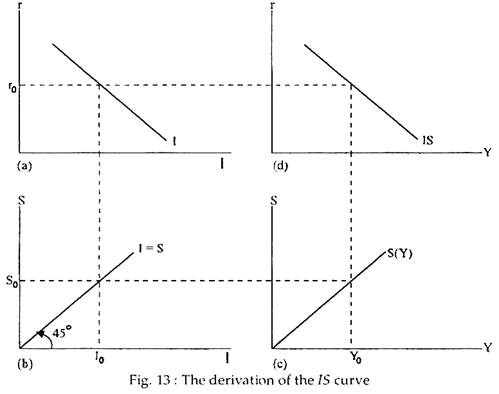 The IS curve is frequently derived graphically with a four-part diagram as shown in Fig. 13. Employing simple linear functions, part (a) of Fig. 13 is a plot of the investment function (the MEI); part (c) plots the saving function, part (b) is simply a 45°-identity line; and part (d) plots the commodity market equilibrium, or IS curve.
