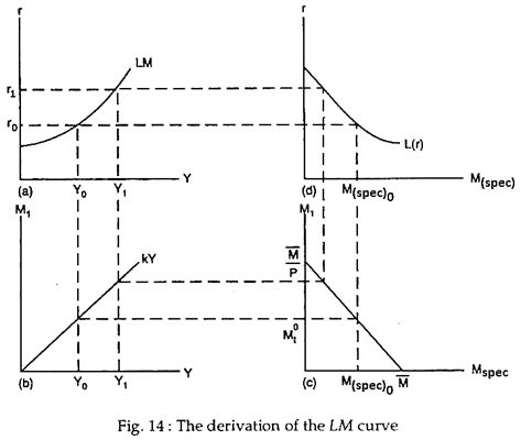 Making use of Keynes’ original distinction between transactions and speculative money demands, the LM schedule is frequently derived graphically using the four-part diagram. See Fig 14. The schedule in part (b) of the diagram represents transactions demand for money, assuming demand to be proportional (with proportionality constant k) to Y.