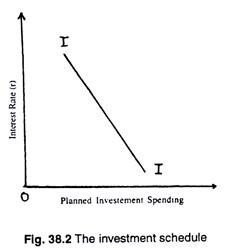 The goods market equilibrium schedule is the IS curve (schedule). It shows combinations of interest rates and levels of output such that planned (desired) spending (expenditure) equals income. The goods- market equilibrium schedule is a simple extension of income determination with a 45° line diagram. Now investment is no longer fully exogenous but is also determined by the rate of interest (which is a policy variable). Fig. 38.2 shows a typical investment (demand) schedule. It shows the planned level of investment (spending) at each rate of interest. Since higher rates of interest reduce the profitability of additions to the capital stock, they imply lower planned rates of investment spending. (Changes in autonomous investment shift the investment schedule). The investment function is expressed as: I = I¯ — cr, c > 0, where r is the rate of interest and measures the interest response of investment. I¯ denotes autonomous investment, that is, investment spending which is independent of both income and the rate of interest.