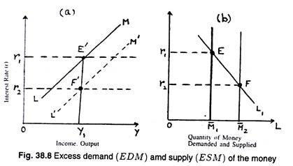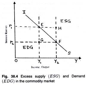 Consequently the demand for investment is higher than that at E, and the demand for commodities is higher than that of E. This simply means that the demand for goods must exceed the level of output, and so there is an excess demand for goods (EDG). Likewise, at point H, the rate of interest is higher than at F. and there is excess supply of goods (ESG). Thus Fig. 38.4 clearly shows that points above and to the right of the IS curve like H, are points of excess supply of goods (ESG). By contrast points below and to the left of the IS curve are points of excess demand for goods (EDG). At a point like G, for instance, the interest rate is too low and aggregate demand is too high relative to output.