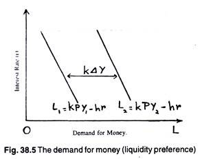Fig. 38.5 shows the demand for money as a function of the interest rate and real income. The money demand function is expressed as: L = kPY — hr, k. h > 0. The parameters k and h reflect the sensitivity of the demand for money to the level of income (Y) and the interest rate (r), respectively. [Here kPY is transaction-cum-precautionary demand for money and hr is speculative demand.] The demand for money (liquidity preference) is drawn as a function of the rate of interest (r). The higher the rate of interest, the lower the quantity of money demanded, at a fixed level of income. An increase in income raises the demand for money. This is shown by a rightward shift of the money demand schedule.