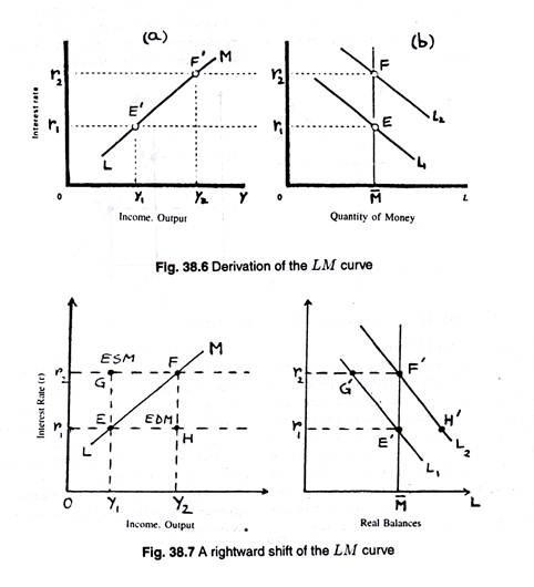 Fig. 38.6 shows how the LM curve is derived. The right hand diagram [part (b)] shows the money market. The supply of money is the vertical line M, since it is fixed by the Central Bank. The two demand for money curves L1 and L2 correspond to two different income levels. When the income level is Y1, the demand curve for money is L1 and the equilibrium rate of interest is n.