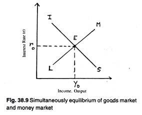 We may now discuss the joint equilibrium of both markets in order to see how output and interest rates are determined simultaneously. For simultaneous equilibrium, interest rates and income levels have to be such that both the goods market and the money market are in equilibrium. Fig. 38.9 shows that the interest rate and the level of output are determined by the interaction of the money (LM) and commodity (IS) markets. Both markets clear at point E. Interest rates and income levels are such that the public holds the existing quantity of money, and planned spending (or desired expenditure) equals output (GNP).