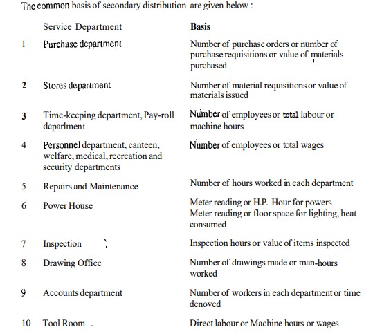 Once the overheads have been allocated and apportioned to production and service departments, next step in overhead distribution is to re-apportion the service department total costs to production department. As the ultimate object is to charge the overhead to cost unit, and no cost units pass through service departments, it becomesnecessary to apportion the service departments costs also to production departments on some equitable basis. This is known as secondary Distribution .
