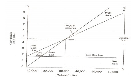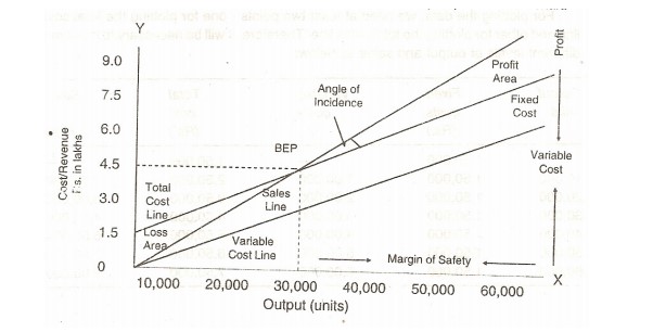 It is a graphic relationship between costs, volume and profits. It shows not only the BEP but also the effects of costs and revenue at varying levels of sales. The break-even chart can therefore, be more appropriately called the cost-volume-profit graph.