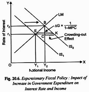 Income equal to CK has been wiped out because of rise in interest causing a decline in private investment. Thus CK represents crowding-out effect of increase in government expenditure Thus, IS-LM model shows that expansionary fiscal policy of increase in Government expenditure raises both the level of income and rate of interest.