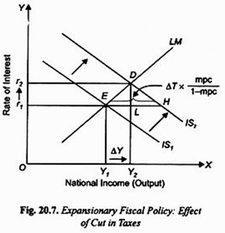It may however be noted that in the Keynesian multiplier model, the horizontal shift in the IS curve is determined by the value of tax multiplier times the reduction in taxes (ΔT), that is, ΔT x MPC/1-MPC and causes level of income to increase by EH.