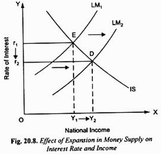 As a result, the economy will move from equilibrium point E to D and with this the rate of interest will fall from r1 to r2 and national income will increase from Y1 to Y2. Thus, IS-LM model shows that expansion in money supply lowers interest rate and raises income.