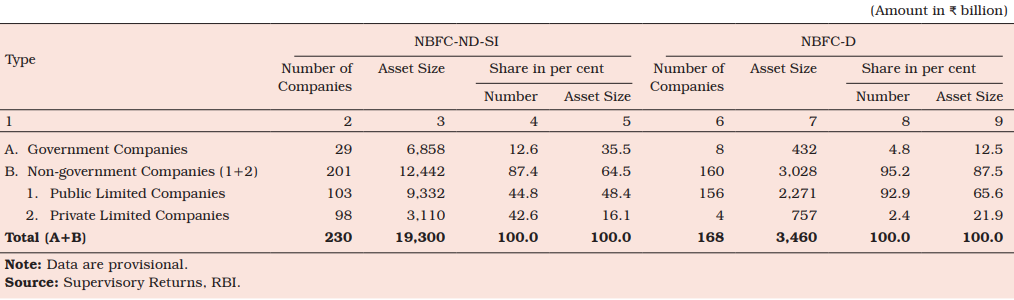 NBFCs-ND-SI constitute 84.8 per cent of the total assets of the NBFC sector. Within the NBFCs-ND-SI sphere, government owned NBFCs hold more than a third assets, indicating their systemic importance (Table VI.2). During 2017-18, the regulatory requirements for government-owned NBFCs—both non-deposit taking and deposit taking—were aligned with those for other NBFCs in a phased manner. NBFCs-D accounted for 15.2 per cent of total assets and 17.6 per cent of the total credit deployed by NBFCs at the end of March 2018. Non-government companies dominate this segment, accounting for 87.5 per cent of assets of all NBFCs-D. Unlike private limited NBFCsND-SI in which 98 companies constituted 16.1 per cent of the total assets, four private limited NBFCs-D accounted for 21.9 per cent of total assets, pointing to concentration of assets.