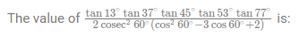 tan 13° tan 37° tan45° tan53° tan77° / 2cosec²60° (cos²60° - 3cos 60°+2) tan13° tan37° tan45° tan/ 2cosec²60° (90°-37°) tan(90°-13°) / (cos²60° - 3 cos 60°+2) (tan13°cot13°) (tan37°cot37°) tan45° / 2 x (2/√3)² { (1/2)² - 3 x 1/2 +2} = 1x1x1 / 2x 4/3 [ 1/4 - 3/2 +2] =1 / 8/3 [1 - 6 +8/4] =1 / (8/3 x 3/4) = 1/2