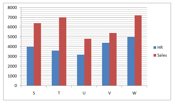 The given bar graph shows the number of HR and Sales employees in five different companies namely S, T, U, V and W.