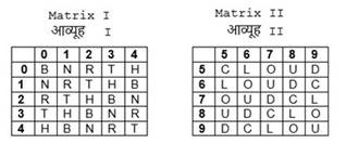 In the following question, a word is represented by only one set of numbers as given in any one of the alternatives. The set of numbers given in the alternatives are represented by two classes of alphabets as in two matrices given below. The columns and rows of Matrix I are numbered 0 to 4 and that of Matrix II are numbered 5 to 9. A letter from these matrices can be represented first by its row and then by its column, example, C can be represented by 55, 69 etc. and D can be represented by 59, 68 etc. Similarly, you have to identify the set for the word given in the question.