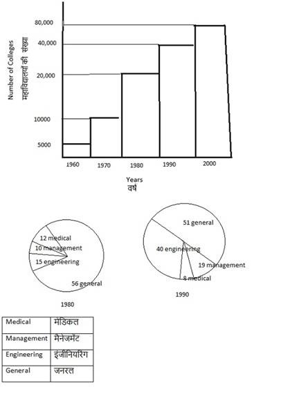 Numbers of different colleges in India in different years is given in the graph below. Percent distribution of different colleges in year 1980 and 1990 is show in pie chart