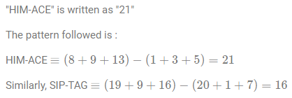 In a certain code language, "HIM-ACE" is written as "21". How is "SIP-TAG" written in that code language?