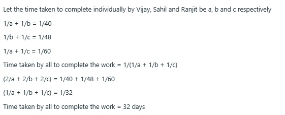 Vijay and Sahil together complete a piece of work in 40 days, Sahil and Ranjit can complete the same work in 48 days and Ranjit and Vijay can complete the same work in 60 days. In how many days can all the three complete the same work while working together?