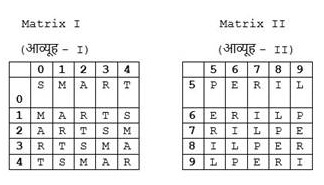 In the following question, a word is represented by only one set of numbers as given in any one of the alternatives. The set of numbers given in the alternatives is represented by two classes of alphabets as in two matrices given below. The columns and rows of Matrix I are numbered 0 to 4 and that of Matrix II are numbered 5 to 9. A letter from these matrices can be represented first by its row and then by its column, example, C can be represented by 55, 69, etc. and D can be represented by 59, 68, etc.
