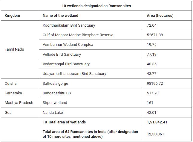 => The 10 new Ramsar sites designated by the Union Ministry of Forest, Environment and Climate Change include six sites in Tamil Nadu and one each in Goa, Karnataka, Madhya Pradesh and Odisha.