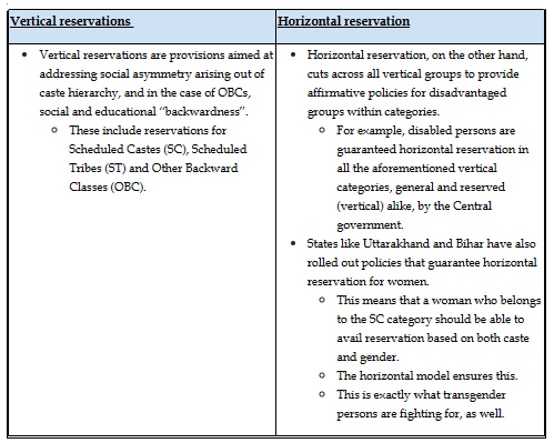=> Transgender persons have filed several petitions of late in the Delhi HC, Madras HC, Rajasthan HC, etc., asking for horizontal reservation in education and jobs.