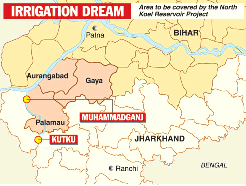 The North Koel rises on the Ranchi plateau and enters Latehar district , below Netarhat near Rud. After flowing nearly due west for about 32 kilometres , it turns north at an almost complete right angle through a gorge at Kutku, and flows through the centre of the district until it falls into the Son a few miles north-west of Haidarnagar.