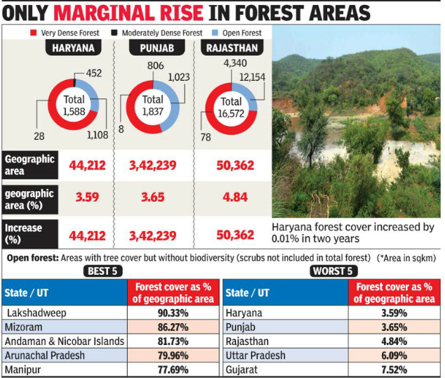 Haryana has pipped Punjab in taking the dubious distinction of the lowest forest cover in the country with only 3.59% green cover, according to the State of the Forest Report (FSI) 2017.