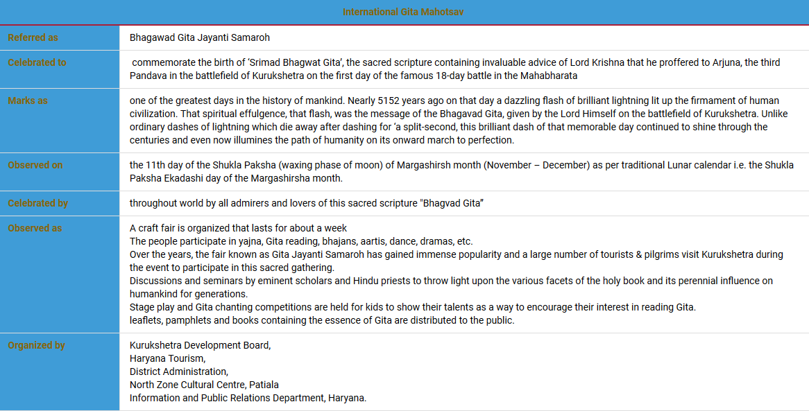 Haryana Chief Minister Manohar Lal Khattar announced to organise International Gita Mahotsav in Kurukshetra, Haryana from 7 to 23 December, 2018.