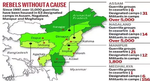 Nagaland, Manipur, Assam and Tripura had been witnessing conflict since 1950-60 period, but since 1990, the intensity of conflicts started to decrease. Now the only state where prominent insurgency exist is Manipur. But in this region several armed factions operate. Some groups call for a separate state, others for regional autonomy while some extreme groups demand complete independence.