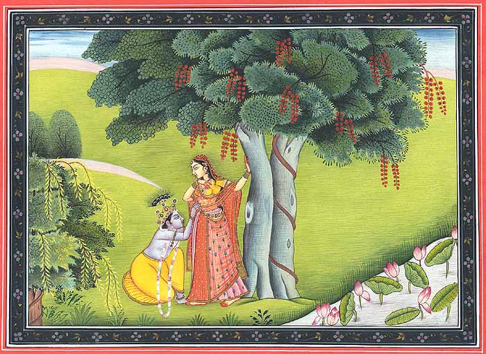 Bhakti cult was the driving force and the love story of Radha and Krishna was the main source of spiritual experience, which was also the base for the visual expression. In some miniatures, the blue-god Krishna is seen dancing in the lush woodlands and every maiden?s eye are drawn to him. The sentiment of love remained the inspiration and the central theme of Kangra painting. The paintings were naturalistic and employed cool, fresh colors. The colors were extracted from minerals,vegetables and possessed enamel-like luster.