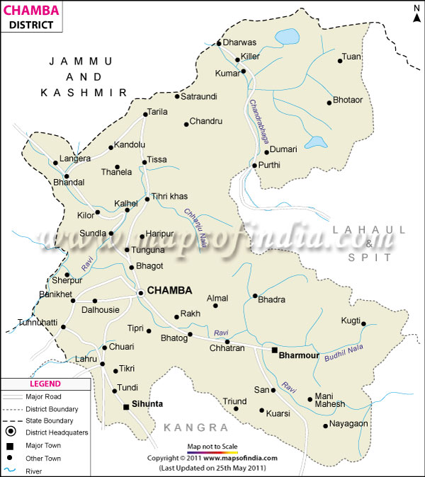 Introduction : Chamba district is placed in the western part of Himachal Pradesh between with the north latitudes 32°10' and 33°13' and east longitudes 75°45' and 77°33'. The main town or headquarter also known as Chamba which is placed on the bank of Ravi River between two mountain ranges, the Dhauladhar ranges and Zanskar ranges. Chamba town was established by the king Sahil Varman in 10th Century.