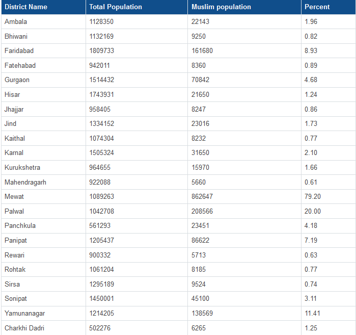 According to the 2011 census, of total 25,350,000 population of Haryana, Hindus (87.46%) constitute the majority of the state's population with Muslims (7.03%) (mainly Meos) and Sikhs (4.91%) being the largest minorities. Muslims are mainly found in the Mewat or Nuh district.