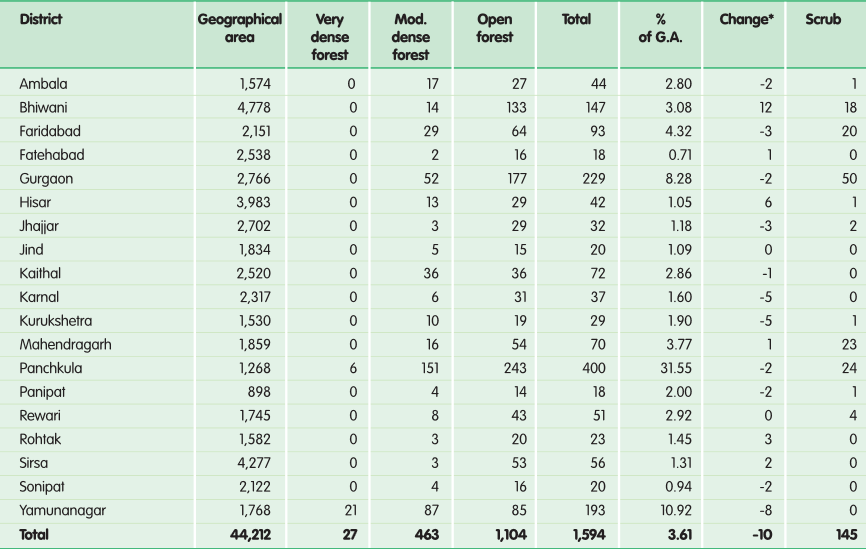 Fatehabad district has the least forest cover area among all the districts of Haryana with just 0.71 Km2 of the total Geographical area of the state .