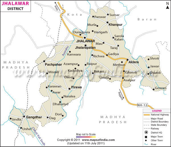 Jhalawar district is one of the 33 districts of Rajasthan state in western India. The district is bounded on the northwest by Kota district, on the northeast by Baran district, on the east by Guna district of Madhya Pradeshstate, on the south by Rajgarh and Shajapur districts of Madhya Pradesh state and on the west by Ratlam, Mandsaur and Nimach districts of Madhya Pradesh state. The district occupies an area of 6928 km². The district is part of Kota division. The historical city of Jhalawar is the administrative headquarters of the district.