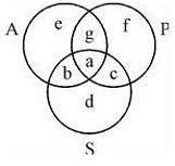 Questions based upon the following diagram in which there are three interlocking circles A, P and S where A stands for Artists, circle P for Professors and circle S for Sportspersons. Different regions in the figure are lettered from a to f:
