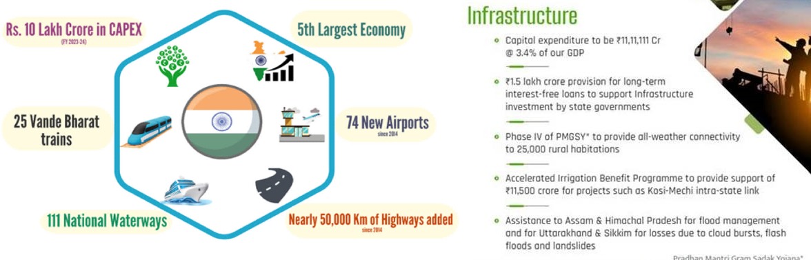 Infrastructure Spending Surge:The government has allocated Rs 11,11,111 crore for capital expenditure on infrastructure, equivalent to 3.4% of the GDP. This marks a doubling of infrastructure spending from 1.7% of GDP three years ago.