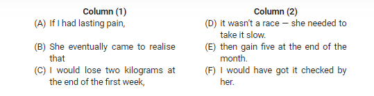 Directions: In the following questions two columns are given containing three Sentences/phrases each. In first column, sentences/phrases are A, B and C and in the second column the sentences/phrases are D, E and F. A sentence/phrase from the first column may or may not connect with another sentence/phrase from the second column to make a grammatically and contextually correct sentence. Each question has five options, four of which display the sequence(s) in which the sentences/phrases can be joined to form a grammatically and contextually correct sentence. If none of the options given forms a correct sentence after combination, mark option (E), i.e. “None of these” as your answer.