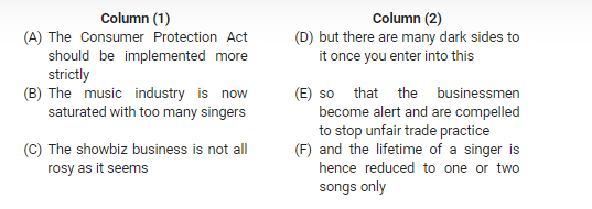 Directions: In the following questions two columns are given containing three Sentences/phrases each. In first column, sentences/phrases are A, B and C and in the second column the sentences/phrases are D, E and F. A sentence/phrase from the first column may or may not connect with another sentence/phrase from the second column to make a grammatically and contextually correct sentence. Each question has five options, four of which display the sequence(s) in which the sentences/phrases can be joined to form a grammatically and contextually correct sentence. If none the options given forms a correct sentence after combination, mark option (E), i.e. “None of these” your answer.