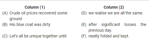 Directions: You are required to match statements from columns 1 and 2 and find which of the following pairs of statement make sense meaningfully and grammatically.