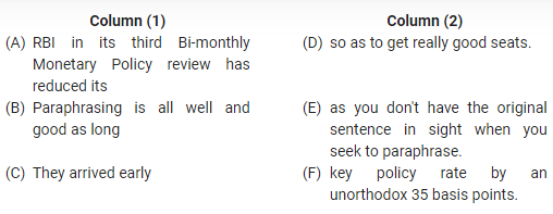 Directions: You are required to match statements from columns 1 and 2 and find which of the following pairs of statement make sense meaningfully and grammatically.