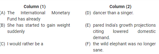 Directions: You are required to match statements from columns 1 and 2 and find which of the following pairs of statement make sense meaningfully and grammatically.