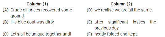Directions: You are required to match statements from columns 1 and 2 and find which of the following pairs of statement make sense meaningfully and grammatically.