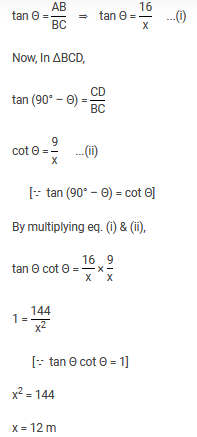 SOME EXAMPLE AND SOLUTION Example 1:The distance between two pillars of length 16 metres and 9 metres is x metres. If two angles of elevation of their respective top from the bottom of the other are complementary to each other, then the value of x (in metres) is 15 16 12 9 SOLUTION: Given, AB = 16 m, CD = 9 m and BC = x metre And, ∠ACB and ∠CBD are complementary. ∴ Let, ∠ACB = Θ and ∠CBD = (90° – Θ) In ΔABC,