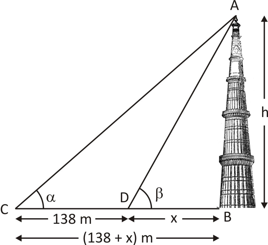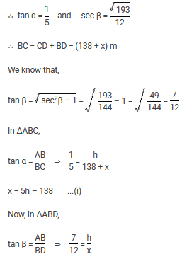 Example 2: A point on a horizontal line through the base of a monument, the angle of elevation of the top of the monument is found to be such that its tangent is 1/5. On walking 138 metres towards the monument the secant of the angle of elevation is found to be √193/12. The height of the monument (in meter) is 35 49 42 56 SOLUTION: Given, the distance walking, CD = 138 m Let, The height of the monument, AB = h metre BD = x metre, ∠ACB = α and ∠ADB = β ⇒ 7x = 12h ⇒ 7(5h – 138) = 12h [From eq. (i)] ⇒ 35h – 966 = 12h ⇒ 23h = 966 ⇒ h = 42 m ∴ The height of the monument is 42 metre.