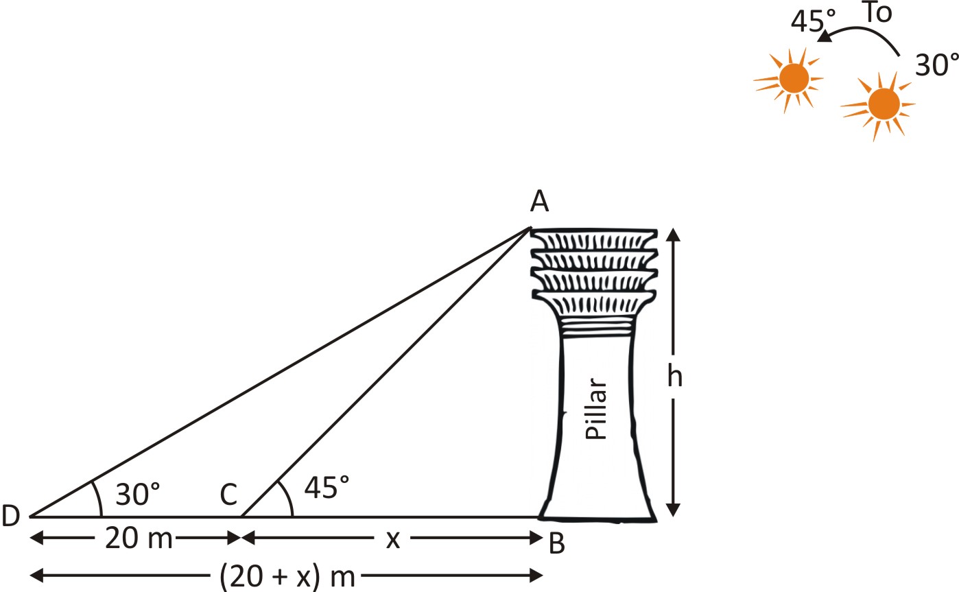 Example 4: If the angle of elevation of the sun changes from 30° to 45°, the length of the shadow of a pillar decreases by 20 metres. The height of the pillar is ? a) 20(√3 - 1)m b) 20(√3 + 1)m c) 10(√3 - 1)m d) 10(√3 + 1) m SOLUTION: