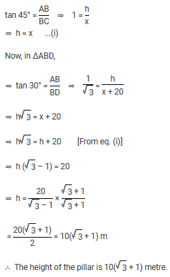 Let, the height of the pillar, AB = h metre. When the sun's angle of elevation was 30°, then the length of shadow of the pillar is BD. And, when the sun's angle of elevation is 45°, then the length of shadow of the pillar is BC = x metre (let). When the sun changes from 30° to 45°, then the length of shadow of the pillar decreases CD = 20 (given) ∴ BD = BC + CD = (x + 20) m In ΔABC,