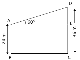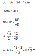 Example 5: The top of two poles of height 24 m and 36 m are connected by a wire. If the wire makes an angle of 60° with the horizontal, then the length of the wire is ? a) 6m b) 8 /√3m c) 8m d) 6 /√3m